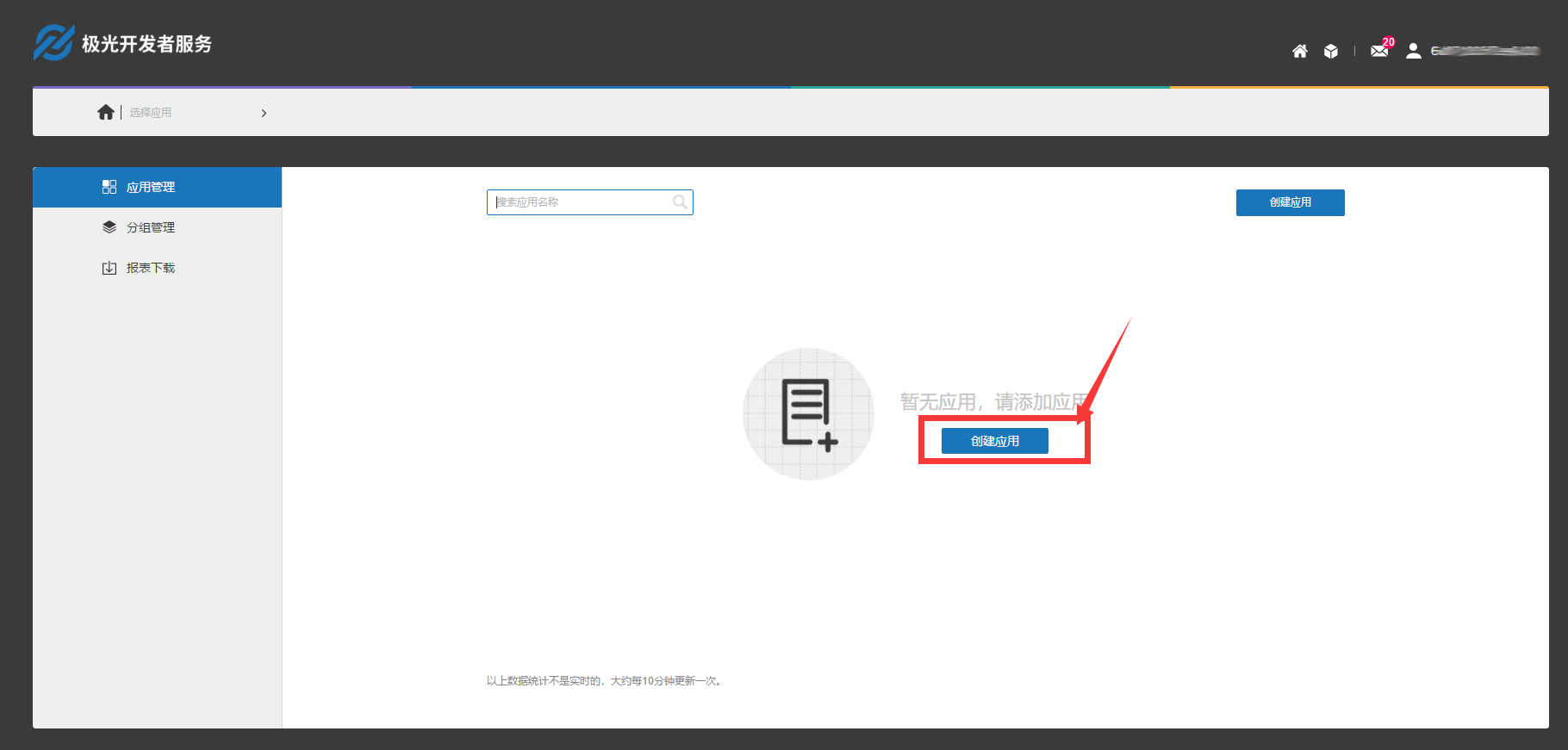 1. 进入服务中心,可以在顶部导航栏【开发者服务】——【极光推送】中,进入以下页面;